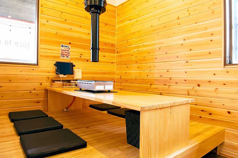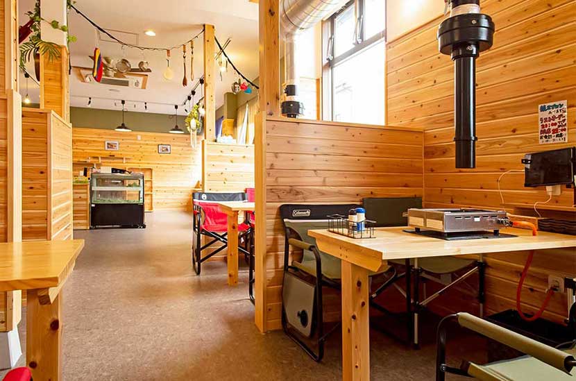 キャンプ場でのBBQ感覚を味わっていただくため、テーブルの椅子はアウトドアチェアを使っております。全席に吸煙ダクトを設置しており、煙も気になりません。お子様も大歓迎です。